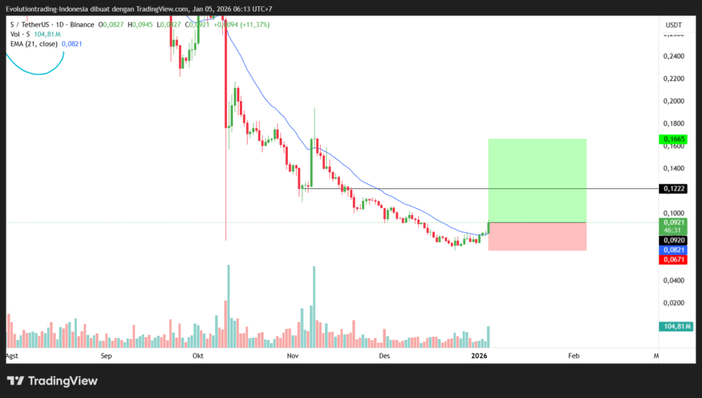 Sonic telah berhasil breakout dari 21 Exponential Moving Average di timeframe 1 hari dengan volume yang besar dan diprediksi akan mengetes level support become resistance-nya di sekitar $0.12 dengan potensi sedikit koreksi.