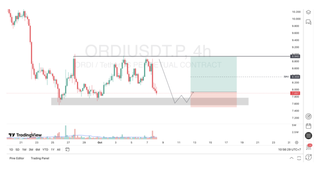 Pelemahan ini diperkirakan akan berlanjut hingga menyentuh zona support di kisaran $7.559–$7.769. Reaksi harga pada area ini akan menjadi penentu arah selanjutnya — apabila terbentuk sinyal rebound yang kuat, maka ORDI berpotensi kembali menguat untuk menguji resistance di level $8.940.